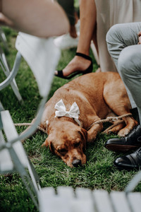 Der Trau-Pavillon, geschmückt mit den üppigen Blumenbouquets, bildete den Mittelpunkt der Zeremonie. In dieser romantischen Kulisse fanden Janina & Nicolai den perfekten Ort, um ihre Liebe zu besiegeln. Die Trauung war emotional, rührend und gefüllt mit liebevollen Worten und Tränen der Freude. Für eine Extraportion Herzlichkeit und Unvergesslichkeit an die Zeremonie sorgte Raja, die Hündin des Brautpaares. Sier war die Überbringerin der Eheringe.